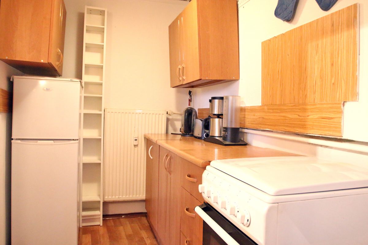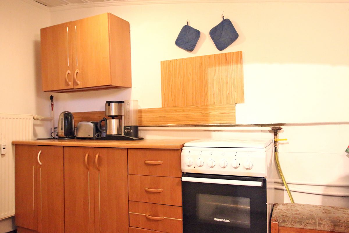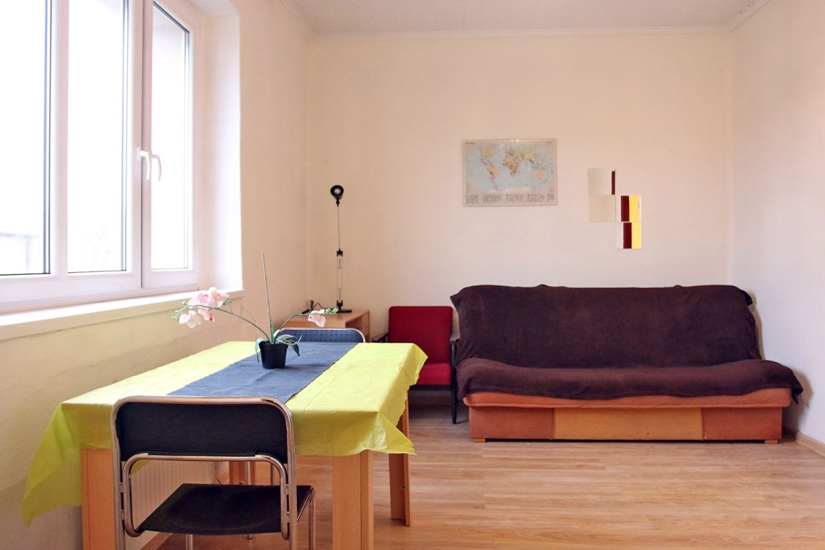 Kuchnia z pełnym wyposażeniem tj. pralka, lodówka, czajnik, toster, ekspres, piecyk z piekarnikiem. W pokoju stół, dwa krzesła, wersalka, biurko komputerowe, lampka nocna, nowe plastykowe okna, żelazko, deska do prasowania.