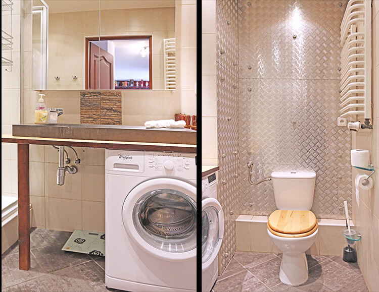 – oryginalnej łazienki wyposażonej w kamienną umywalkę, szafkę z dużym lustrem, szklaną kabinę prysznicową, pralkę Whirlpool na gwarancji, WC, grzejnik drabinowy.
