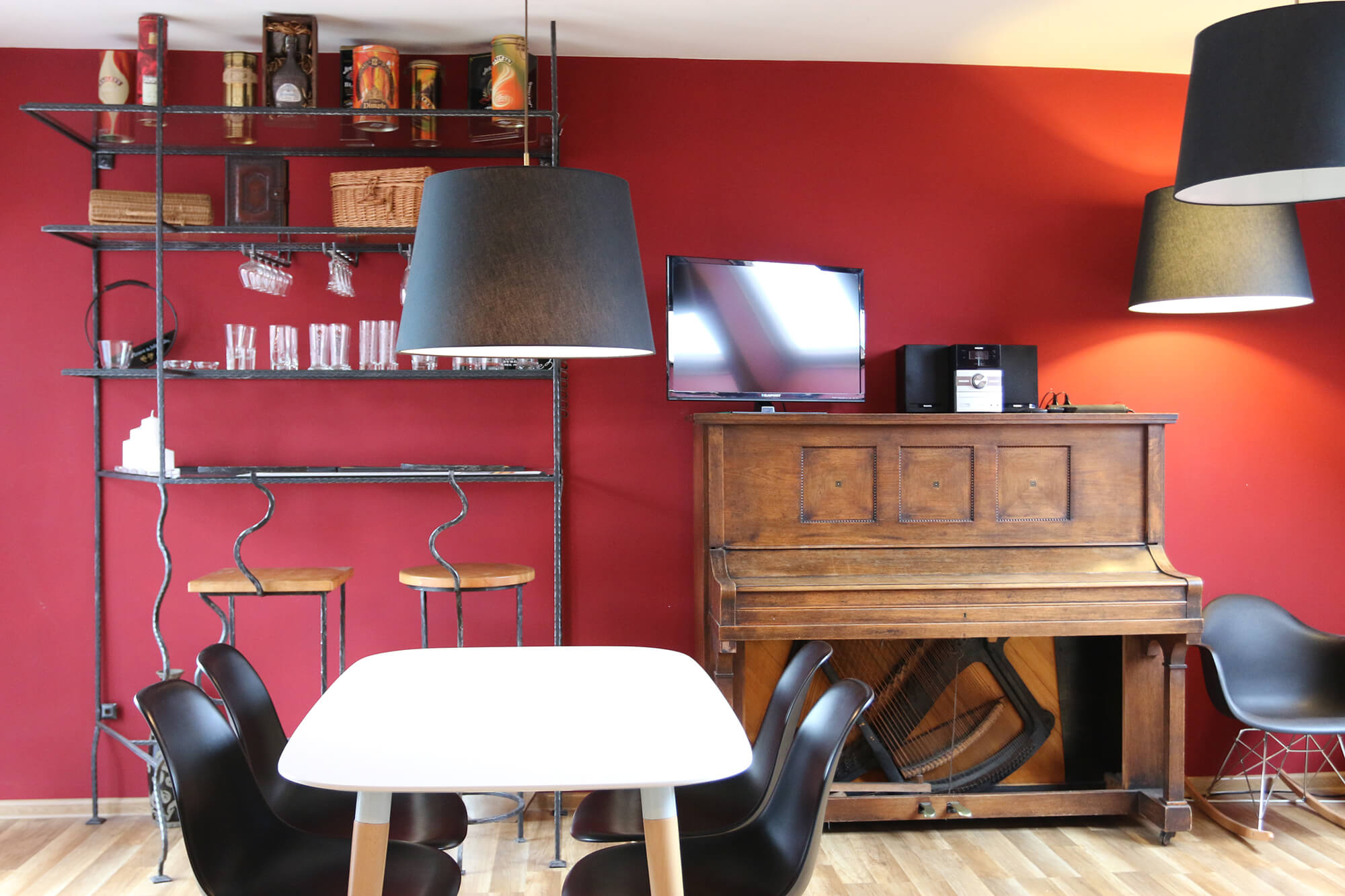 – przestronnego, klimatyzowanego salonu z wyjściem na duży taras, gdzie można odpocząć i zrelaksować się po ciężkim dniu pracy,